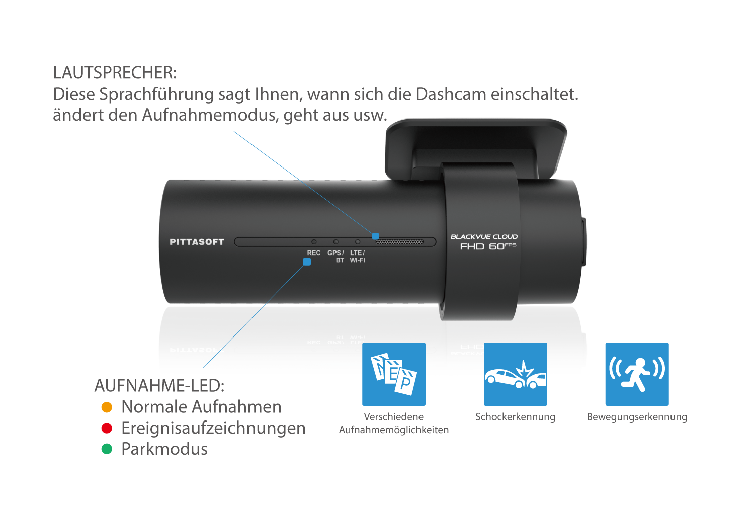 Zusätzlich kann die Dashcam im Parkmodus auch durch Bewegung aktiviert werden. In beiden Fällen werden auch die vorherigen 5 Sekunden gespeichert, sodass Sie immer ein Bild davon haben, was vor der Schock- oder Bewegungserkennung passiert ist.