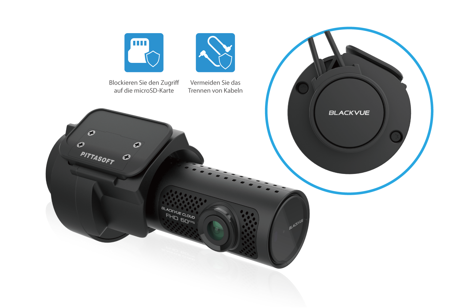Der manipulationssichere Halter BlackVue BTC-1 (A / B) stellt sicher, dass die microSD-Karte, das Netzkabel, das Koaxialkabel und die Wi-Fi-Taste abgeschirmt sind.