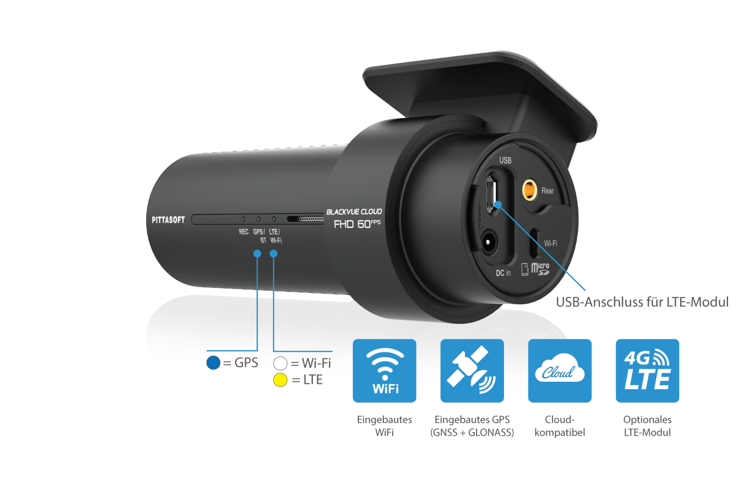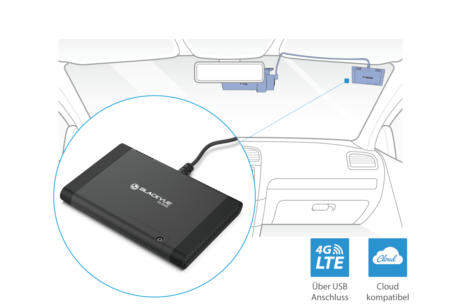 Der CM100LTE kann an den USB-Anschluss Ihrer Dashcam angeschlossen werden. Ihre BlackVue-Dashcam versorgt das CM100LTE-Modul mit Strom, und das CM100LTE-Modul bietet die einfachste und stabilste Cloud-Verbindung.
