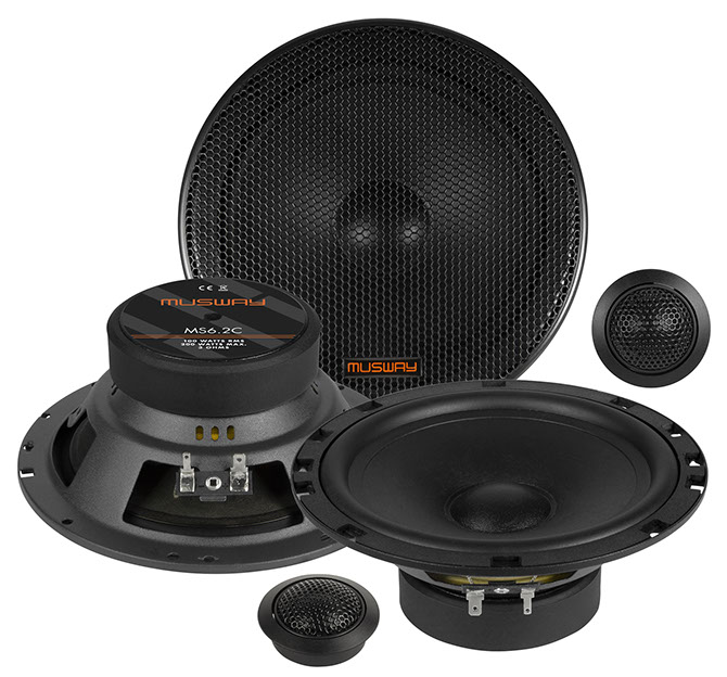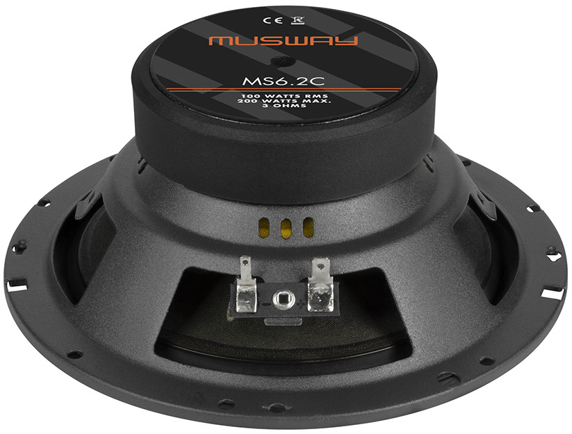 MS6.2C, 16,5 CM (6.5”) 2-WEGE KOMPONENTEN-SYSTEM, 100 Watt/RMS, 200 Watt/MAX, Frequenzbereich 62 - 22000 Hz, Impedanz 3 Ohm, Papier-Bambus-Membranen, Separate Frequenzweichen für Hochtöner und Bass, 25 mm Gewebe-Neodym-Hochtöner, Schutzgitter, Einbautiefe 62 mm, Einbauöffnung 144 mm