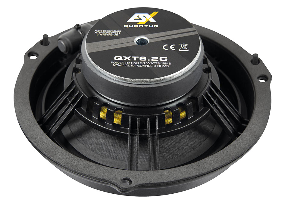 Der Tiefmitteltöner mit verstärkter und wasserabweisender Membran ist mit einem sehr großen, 13 Unzen schweren Ferrit-magnet bestückt. Der üppige Antrieb führt zusammen mit der bewusst niedrig gewählten Impedanz von 3 Ohm zu einem sehr guten Wirkungsgrad von 93 dB an 2,83V/1m. Im Zusammenspiel mit der bewährten 25 mm Gewebe-Hochtonkalotte mit Neodymantrieb entwickelt das QXT6.2C Komponenten-Seystem an jedem Radio oder Verstärker eine unglaublich lebendige Spielfreude.