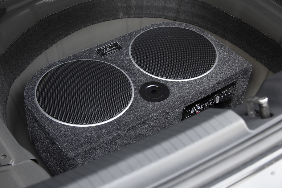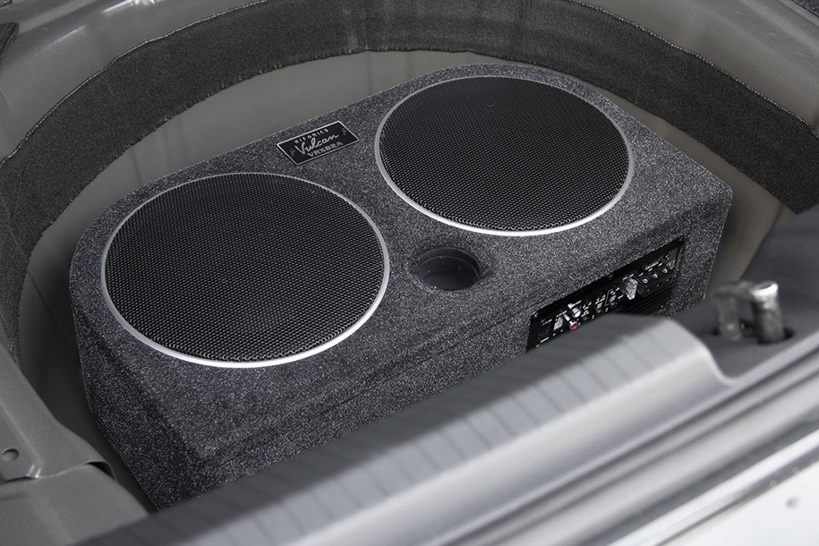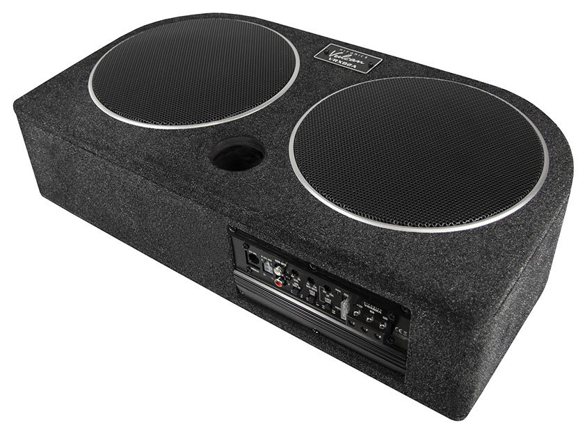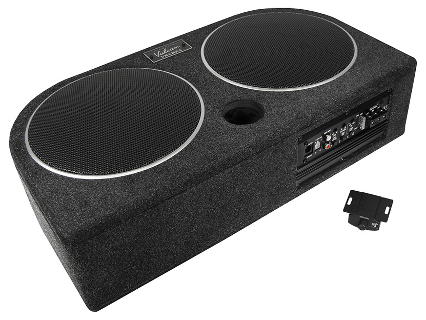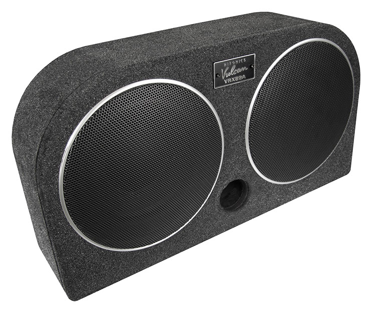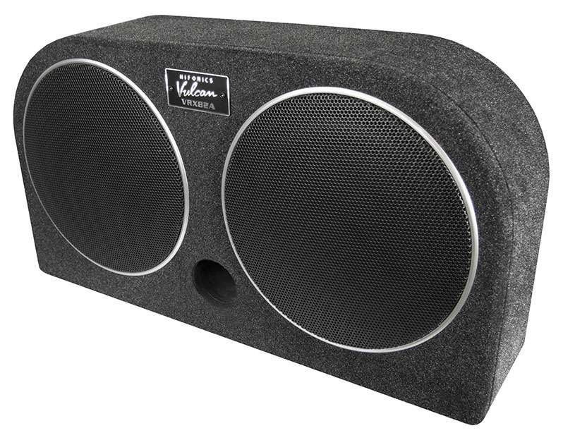 Die flache, hinten abgerundete Gehäuseform des neuen VULCAN VRX82A Aktivsystems ermöglicht die Installation in der Reserveradmulde oder auch aufrecht stehend, indem die mitgelieferten Gummifüße unten am Gehäuse montiert werden. Der Clou des neuen VULCAN Systems ist die quasi mitschwingende Passiv-Membran, die neben dem aktiv angetriebenen Tieftöner für die zusätzliche und für tiefe Frequenzen wichtige Luftverdrängung sorgt. Die VRX82A ist hier im Vorteil, denn herkömmliche Bassreflexgehäuse neigen dazu, Strömungsgeräusche am Reflexport zu erzeugen, welcher auch noch wertvolles Innenvolumen wegnimmt. Nicht so bei den Systemen mit Passiv-Strahler, welcher hierbei wie ein Bassreflexkanal fungiert – nur eben ohne lästige Störgeräusche. Ein integrierter, mit über 80% Wirkungsgrad arbeitender Class-D Amp sorgt für hohe 200 Watt RMS und liefert dem Subwoofer effiziente Digitalpower.