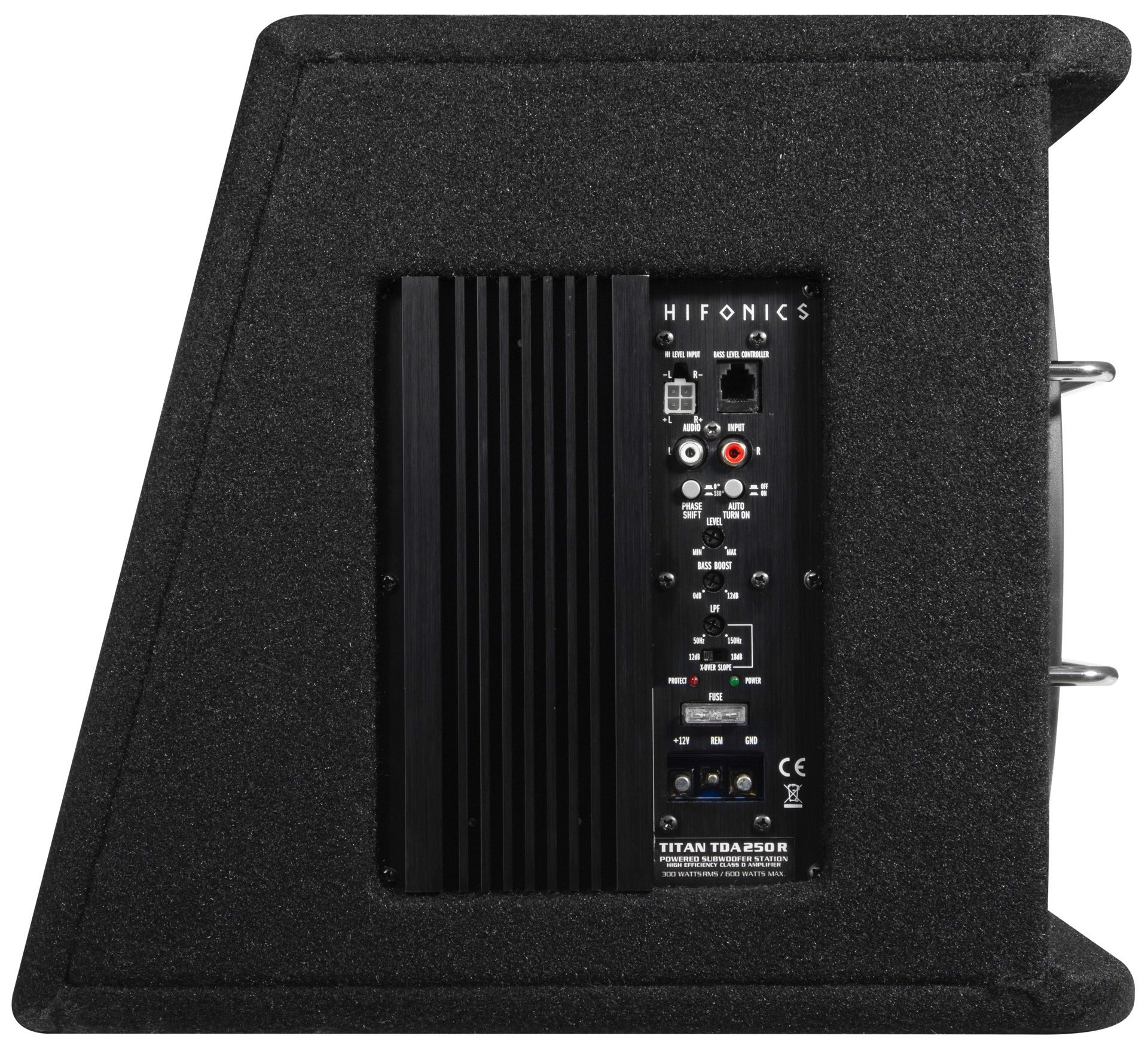 TDA-250R B-Ware, 2 x 25 cm (10") Aktiv-Dual-Bassreflex, 300 W/RMS, 600 W/MAX, LP 50 - 150 Hz @ 12/18 dB, Phase Shift 0°/180°, Bass Boost 0 - 12 dB, Subsonic 15 Hz fix, Automatische Einschaltfunktion über Hochpegel-Eingänge, RCA Eingänge, Basspegel-Kabelfernbedienung, Abmessungen: 77 x 32 x 36/28 cm