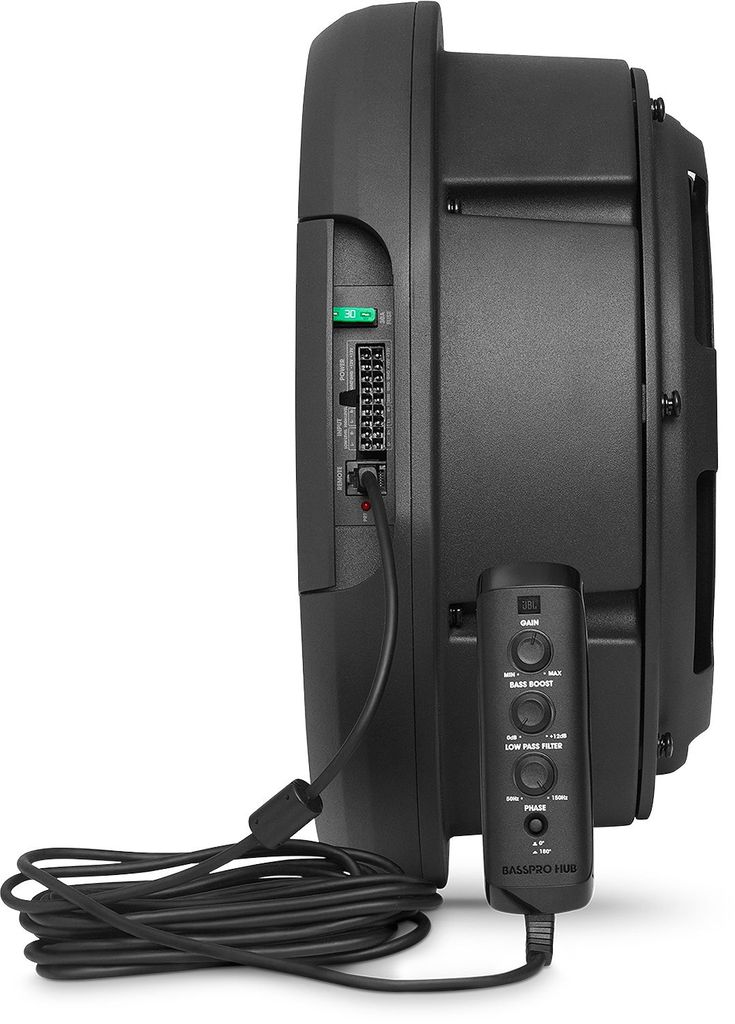Der neue JBL BassPro Hub-Subwoofer bietet Show & Shine-Performance, ohne die Ladefläche zu opfern. Dieses All-in-One-Subwoofer-System passt in die Ersatzradmulde und sorgt für eine superleichte Installation und Soundlösung ohne Sichtbarkeit. Der eingebaute Class-D-Verstärker liefert 200 W RMS. Der 279 mm federleichte Fiberglas-Tieftöner mit Gummisicke liefert den charakteristischen Kick und Punch des JBL-Basses. Und mit Übertemperaturschutz (OTP) und Überstromschutz (OCP) können Sie sich auf höchste Belastbarkeit verlassen. Die mitgelieferte Fernbedienung ermöglicht die Einstellung von Crossover-Punkt, Gain, Phase und einem Bass Boost von 12 dB.