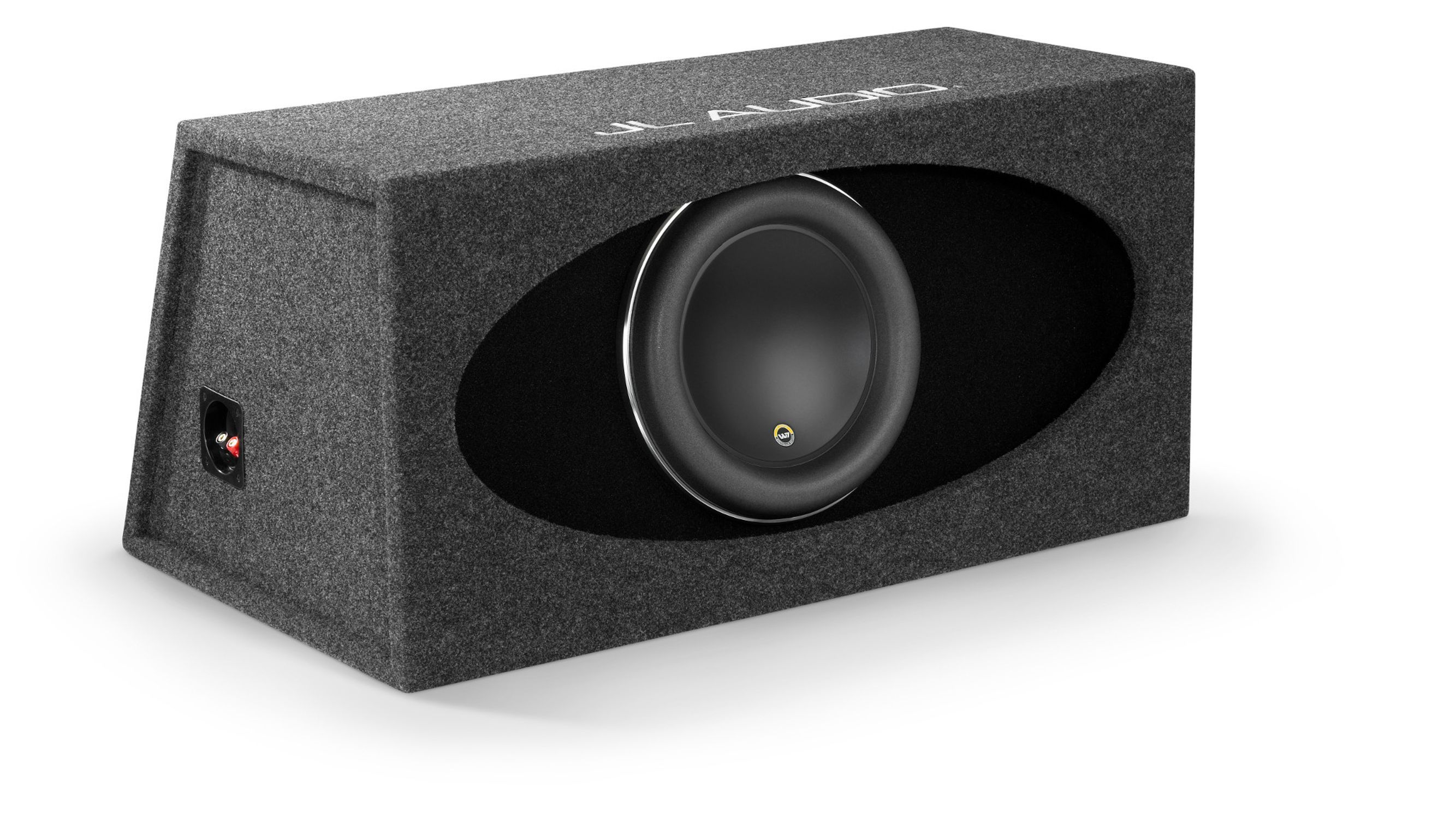 - Oberfläche: Dunkelgrauer, hochwertiger Fahrzeugteppich, mit schwarzem Teppich auf der Schallwand des Tieftöners. "JL AUDIO" ist auf der Oberseite des Gehäuses in Silber gestickt.