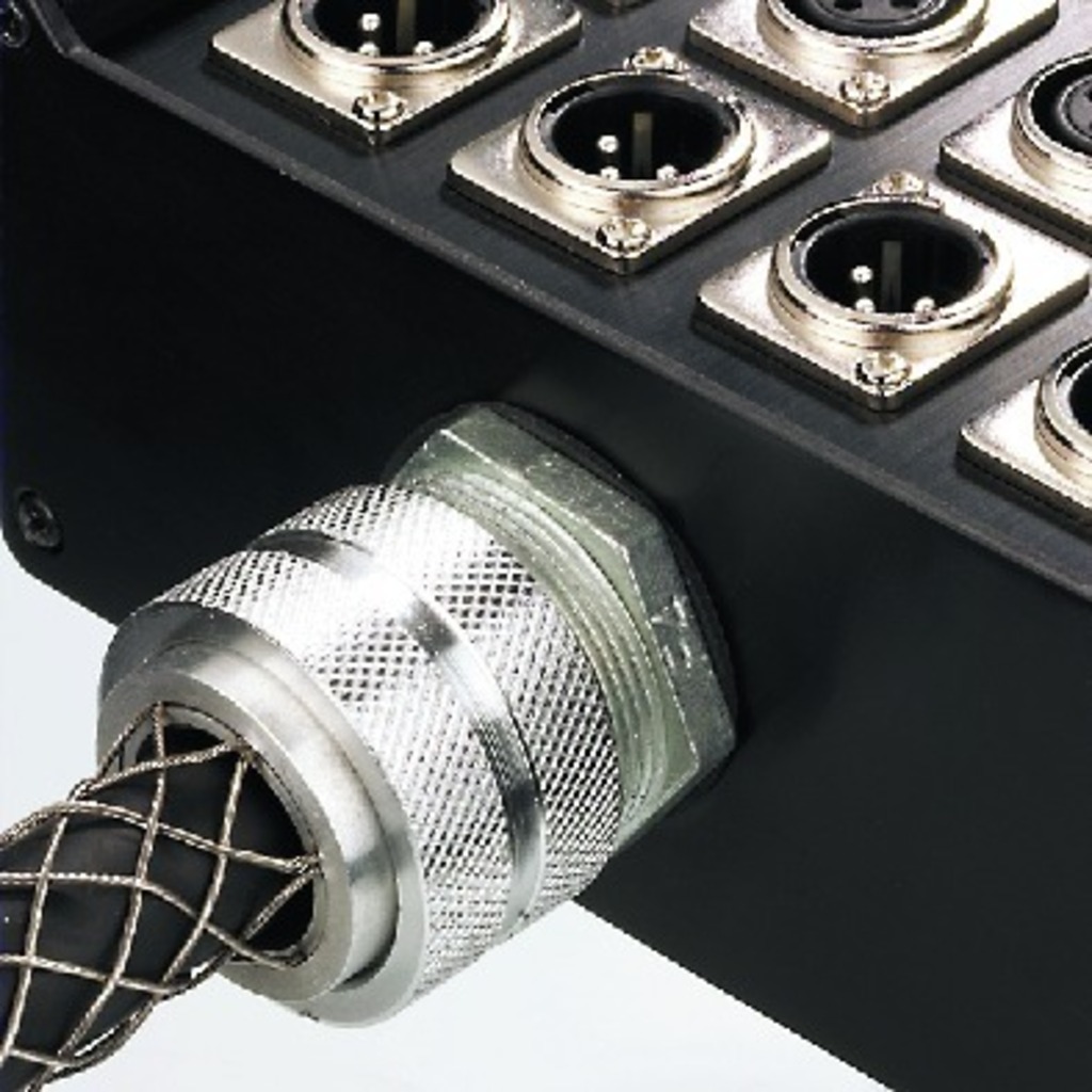 zur Multiweg-Signalübermittlung zwischen Bühne und Mischer, Stage-Box in Aluminiumausführung mit robustem Tragegriff.
