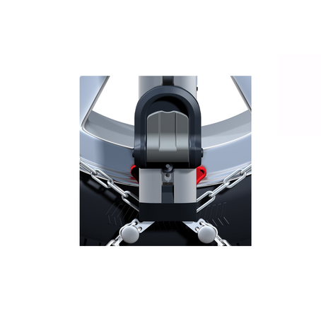 - Die mittlere Schiene aus Aluminium ist das Herz des automatischen Spannsystems: Klappen Sie einfach das in die mittlere Schiene integrierte Pedal heraus und drücken Sie es mit dem Fuß nach unten, um den Spannvorgang zu aktivieren. Beim Anfahren des Wagens wird die Kette automatisch um den Reifen geführt.